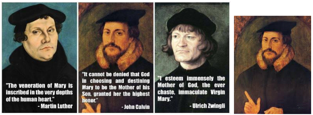 => 위, 왼쪽에서 처음 세 장의 이미지: 개혁가로 변신한 전 가톨릭 신자들(루터, 칼빈, 즈윙리 등)은 성경의 참 하나님이 아닌, 로마 가톨릭과 ‘성령 마리아’ 또는 ‘땅 여신’에 대한 충성을 고백했습니다. 개혁가들은 모두 로마 가톨릭 교리의 이 ‘신의 어머니’를 일부 변형하여 받아들였습니다. 그러나 성경의 실제 마리아는 사람의 모습으로서의 예수 그리스도의 인간 어머니에 불과했습니다. 하나님으로서의 예수님은 어머니가 없습니다! (히 7:3) 그는 아버지도 없고 어머니도 없고 혈통도 없고 날들의 시작도 없고 생명의 끝도 없어 오직 [하나님]의 [아들]과 같이 되어 항상 제사장으로 있느니라.