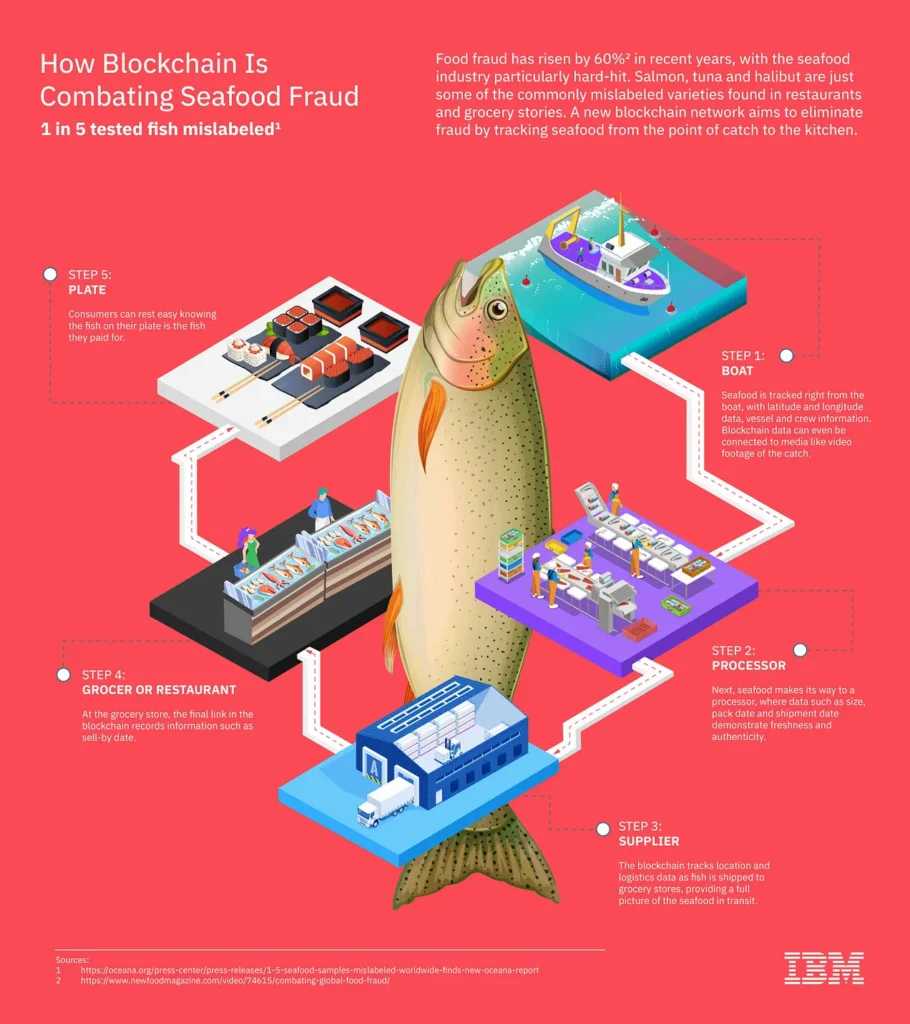 일부 기업들은 이미 이 관행을 도입하기 시작했습니다. 2021년, 글로벌 해산물 얼라이언스는 블락체인과 분산원장기술(DLT)이 “사기를 줄이고 제품을 차별화할 수 있는 방법”을 선전하는 보고를 발표했습니다. 노르웨이 북부에서 가장 큰 연어 양식업체 중 하나인 노바 씨(Nova Sea)는 컴퓨팅 대기업 IBM이 주도하는 국가 해산물 추적 네트워크인 노르웨이 해산물 트러스트에 합류했다고 발표했습니다. IBM은 토큰화의 다섯 단계를 설명하는 차트를 제작했습니다: