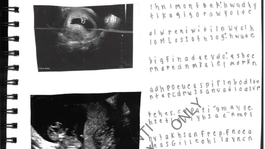 여러 저널 페이지에는 아기 초음파와 함께 충격적인 단어들, 시들, 암호화된 메시지들이 포함되어 있습니다.
