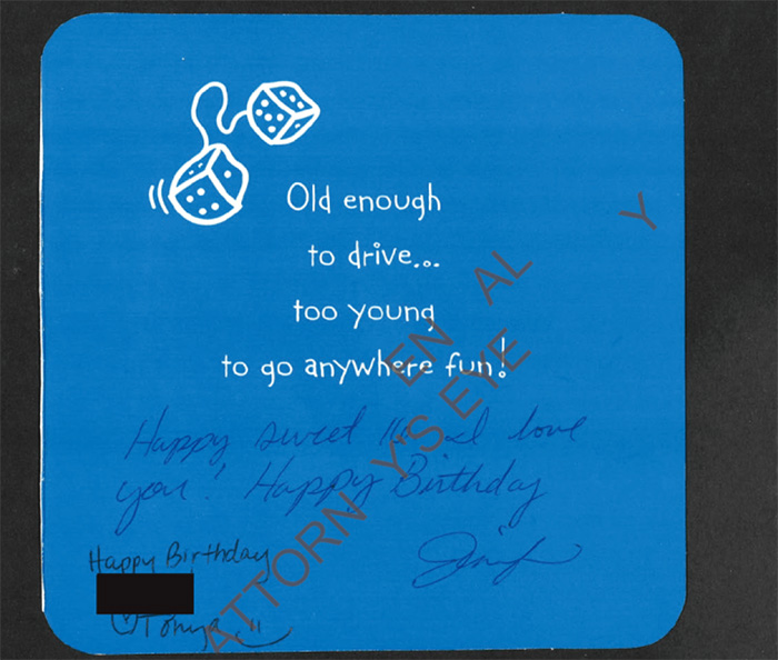 한 저널에는 소녀의 16번째 생일을 축하하는 카드가 붙어 있습니다. 이 시점에서 소녀는 이미 한동안 엡스틴의 통제하에 있었습니다.
