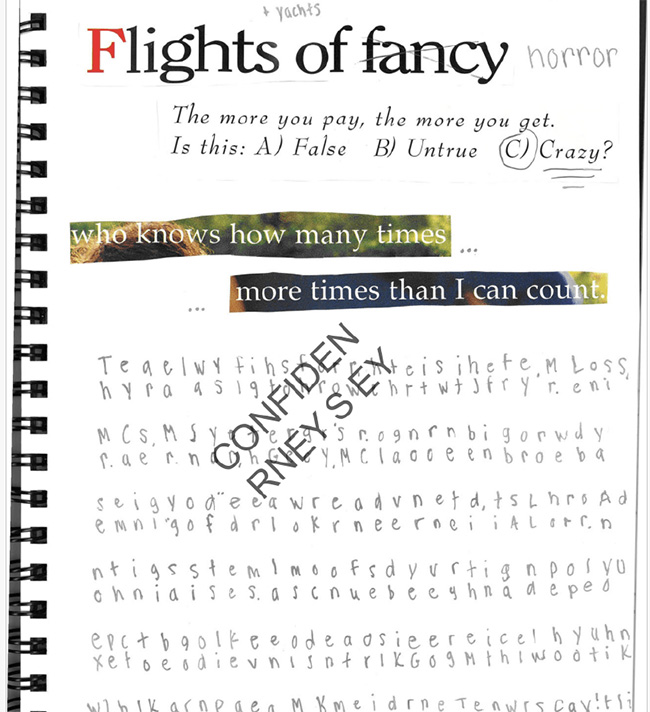 위 페이지에서 소녀는 잡지 헤드라인 “호화 비행기(Flight of fancy)”를 “공포의 비행기들(Flights (+요트) of horror)”로 바꿨습니다. 아래에는 이러한 공포의 비행기들을 설명하는 암호화된 메시지(한 번에 두 줄씩 세로로 읽음)가 있습니다. 이 페이지의 내용은 다음과 같습니다: