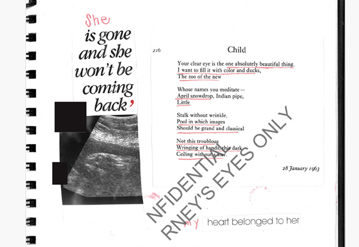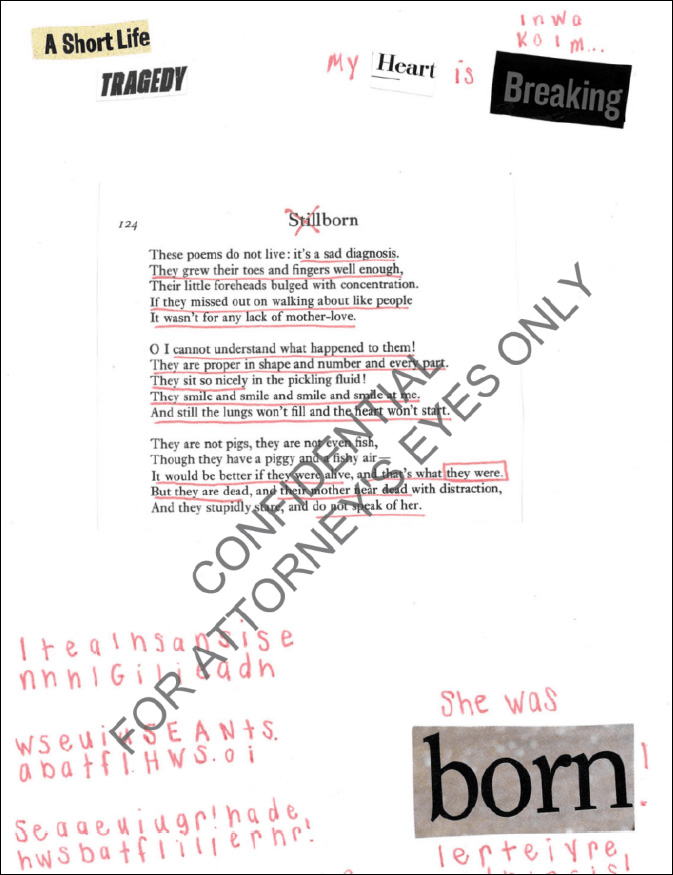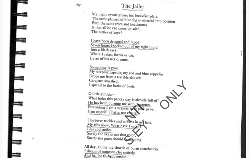 다른 페이지에는 (1963년 불명예스럽게 스스로 목숨을 끊은) 실비아 플래스의 시가 붙어 있습니다. 각 경우마다 소녀는 “나는 마약이 주입돼 강간을 당했다. 일곱 시간 동안 정신이 나가 있었다”와 같이 자신에게 특히 적용된 구절들에 밑줄을 그었습니다.