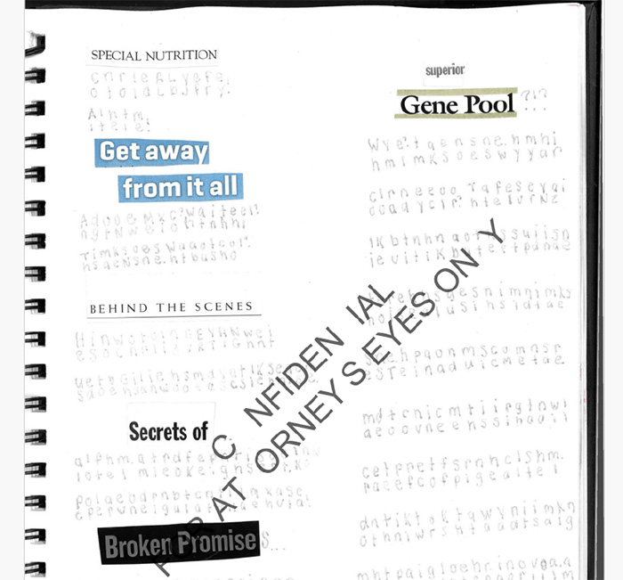 저널은 잡지에서 잘라낸 단어와 구절, 그리고 그녀 자신의 손글씨로 된 추가 자료들로 구성되어 있습니다.