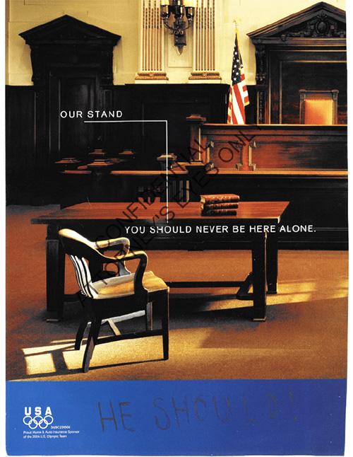 한 페이지에서 소녀는 “우리의 입장. 절대 여기 혼자 있으면 안 된다”라는 문구가 적힌 법정을 묘사한 올스테이트 인슈어런스 광고를 붙였습니다. 사진 아래에는 소녀가 “그는 그래야 한다!”라고 적었습니다.
