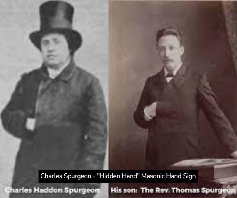 찰스 해든 스펄전 – “감추어진 손” 매소닉 핸드 싸인(왼쪽), 그의 아들 토마스 스펄전 목사(오른쪽)