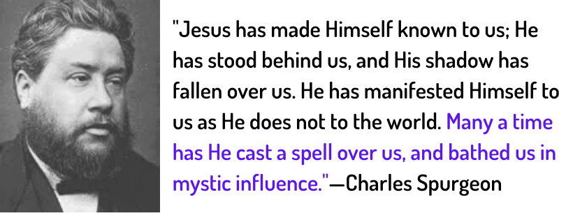 “예수는 우리에게 그를 드러냈다; 그는 우리 뒤에 서있고, 그의 그림자가 우리 위에 드리워져 있다. 그는 자신을 세상에는 나타내지 않았으나 우리에게는 나타냈다. 그는 여러 번 우리에게 주문을 걸었고, 우리를 신비한 영향력에 잠기게 했다.” – 찰스 스펄전