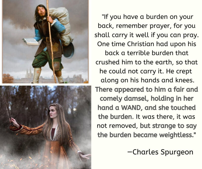 당신이 등에 짐을 지고 있다면 기도를 기억하세요. 기도할 수 있다면 짐을 잘 질 수 있을 것입니다. 한 번은 어떤 크리스찬이 질 수 없는 엄청난 짐을 지고 있어서 땅에 닿게 눌려 손과 무릎으로 기어갔습니다. 그런데 지팡이를 손에 든 눈부시게 아름다운 여인이 나타나 그의 짐을 건드리자, 짐이 여전히 거기에 있었고 제거되지는 않았지만, 이상하게도 무게가 느껴지지 않았습니다. – 찰스 스펄전