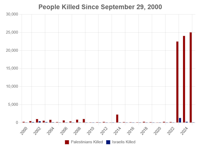 2000년 이후 최소 82,209명의 팔레스타인인들과 3,017명의 이스라엘인들이 반대편의 누군가에 의해 살해당했습니다.