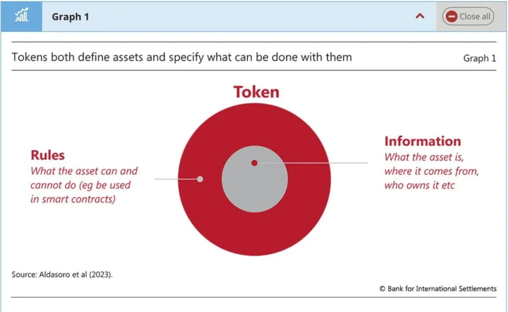 국제결제은행(BIS)에서 정의한 ‘토큰’은 “디지털로 기록되고 토큰 자체 내에 정보와 기능을 포함할 수 있는 데이타베이스 항목을 말합니다. 디지털 토큰은 금융 자산이나 실물 자산을 나타낼 수 있습니다.” 토큰은 소유권, 구매/판매 날짜, 거래 날짜 등 해당 기본 디지털 화폐나 자산의 근간이 되는 정보를 수집한다고 국제결제은행(BIS)은 설명합니다.