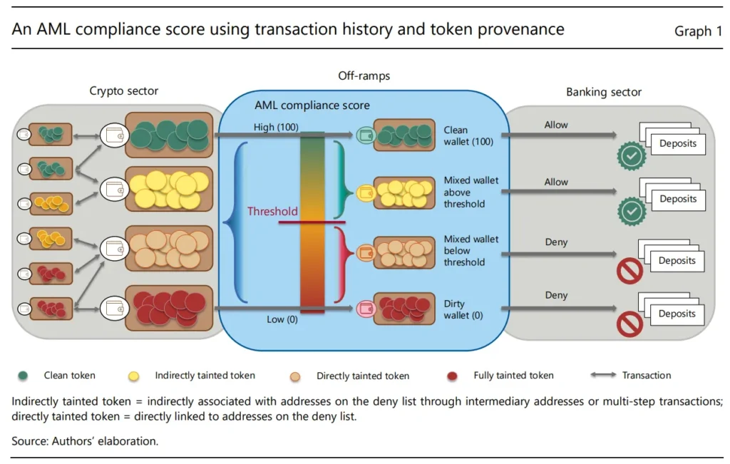이에 대응하기 위해 국제결제은행(BIS)은 거래 내역을 기준으로 토큰과 지갑을 100~0점 척도로 순위를 매기는 자금세탁방지(AML) 준수 점수를 제안합니다. 이 점수는 “깨끗한 토큰”이라고 부르는 것부터 “완전히 오염된 토큰”까지 다양합니다. 그런 다음 이러한 토큰의 관리자와 발행자는 정해진 일련의 규칙에 따라 이러한 점수를 적용할 수 있습니다.